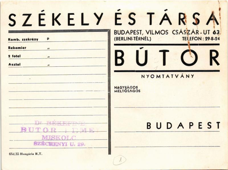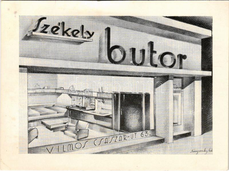 Székely és Társa bútoráruház reklámja. Budapest VI. Vilmos császár út 63. (Bajcsy-Zsilinszky út) / Hungarian furniture store advertisement postcard (fl)