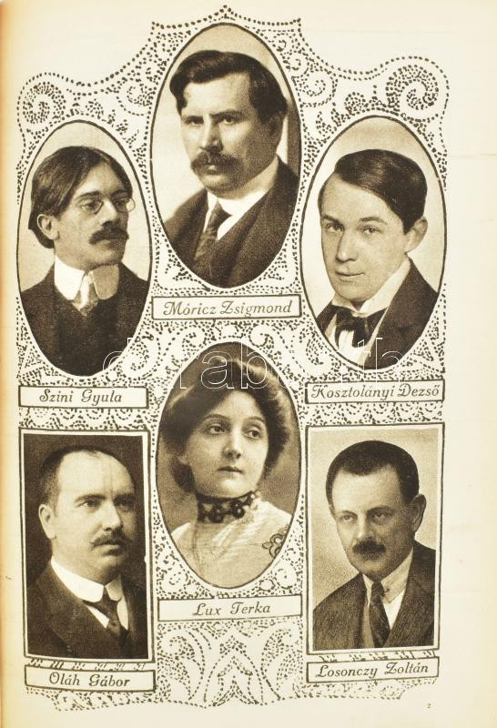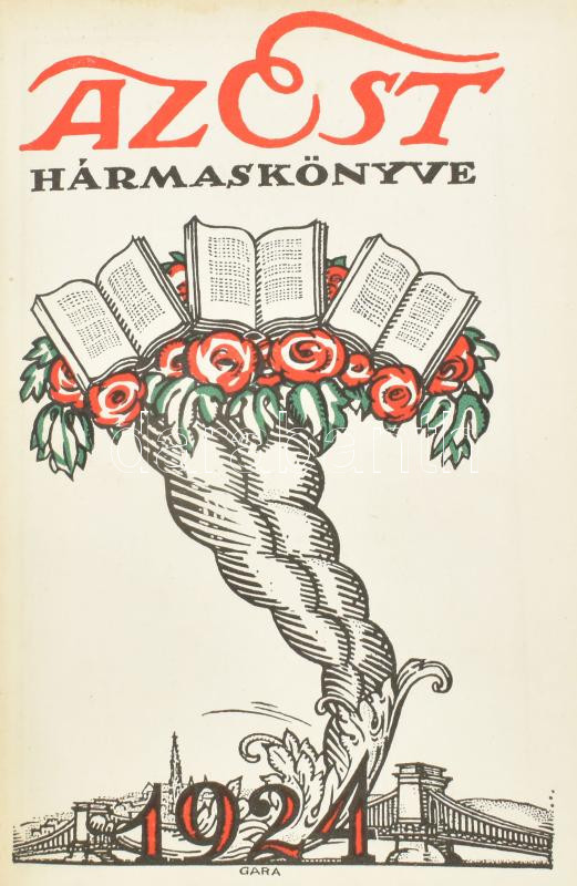 1924 Az Est hármaskönyve. Száz magyar író verse és elbeszélése. A háziasszonynak. A tőzsde. Bp., 1924., Az Est Lapkiadó Rt., (Athenaeum Rt.-ny.), 312 p. Bekötött borítókkal, az elülső papírborítón Gara Arnold illusztrációkkal. Gazdag képanyaggal illusztrált, közte Pólya Tibor illusztrációjával, fekete-fehér fotókkal, rajta Móricz Zsigmond, Kosztolányi Dezső, Juhász Gyula, Babits Mihály fotóival. Korabeli reklámokkal. Érdekes írásokkal. Korabeli receptekkel. Kiadói aranyozott egészvászon-kötés, kopott borítóval, egy-két kissé foltos lappal.