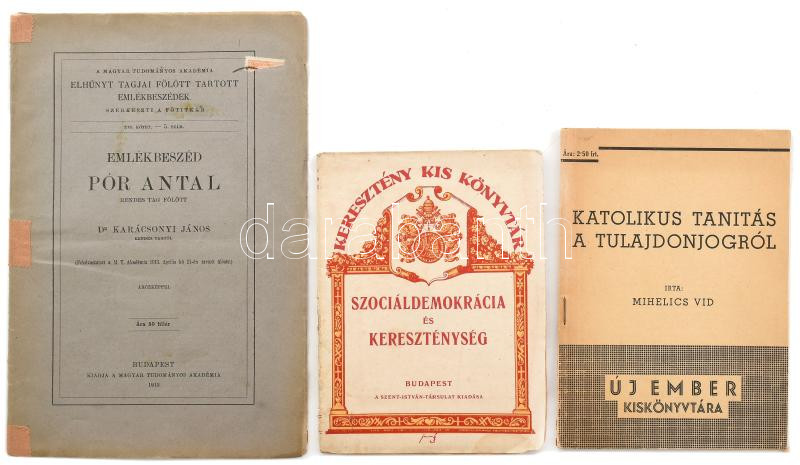 3 db füzet: Mihelics Vid: Katolikus tanítás a tulajdonjogról; Szociáldemokrácia és kereszténység; Dr. Karácsonyi János: Emlékbeszéd Pór Antal rendes tag fölött. (A Magyar Tudományos Akadémia elhúnyt tagjai fölött tartott emlékbeszédek XVI. köt. 5. sz.) Vegyes állapotban.