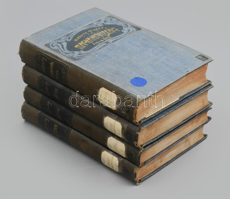 B. Eötvös József 4 műve: Beszédek I-III. köt.; Magyarország 1514-ben. Bp, 1901-1902, Révai. Kiadói szecessziós aranyozott, egészvászon-kötés, Gottermayer-kötés, ex libris-szel, magánkönyvtári bélyegzésekkel és címkékkel, kopott borítókkal.
