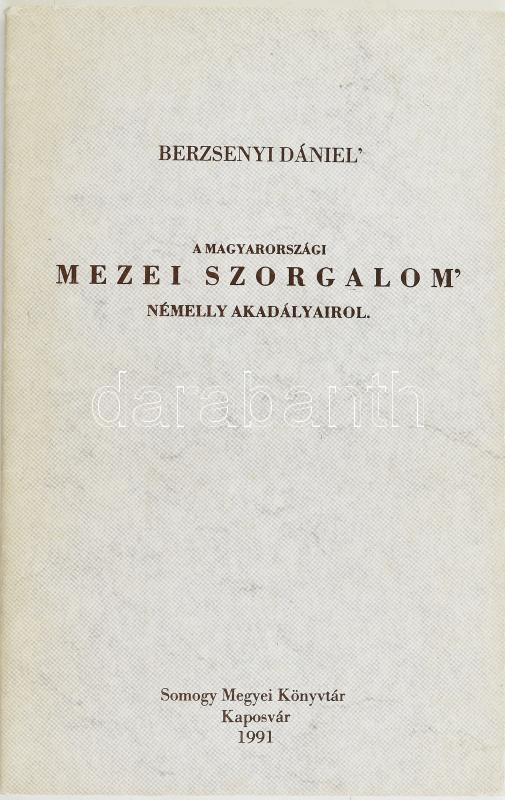 Berzsenyi Dániel: A magyarországi mezei szorgalom' némelly akadályairo... https://www.darabanth.com/hu/445-Gyorsarveres/445.0/Konyvek/Konyvek-Egyeb-ritkasagok~1500028/Berzsenyi-Daniel-A-magyarorszagi-mezei-szorgalom-nemelly-akadalyairol-Kaposvar-1991-Somogy~II2938625