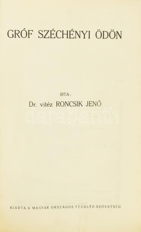 Dr. vitéz Roncsik Jenő: Gróf Széchényi Ödön. Bp., 1947, Magyar Országos Tűzoltó Szövetség,(Debrecen, Városi-ny.), 365+1 p. Fekete-fehér fotókkal illusztrált. Kiadói aranyozott egészvászon-kötés, a borítón kis kopásnyomokkal.