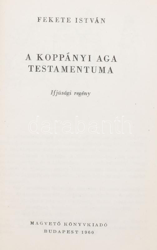 Fekete István 2 műve: A koppányi aga testamentuma. Bp., 1960, Magvető. Kiadói félvászon-kötés, a gerincen kisebb folttal. + Bogáncs. Bp., 1992, Nesztor. Kiadói papírkötés.