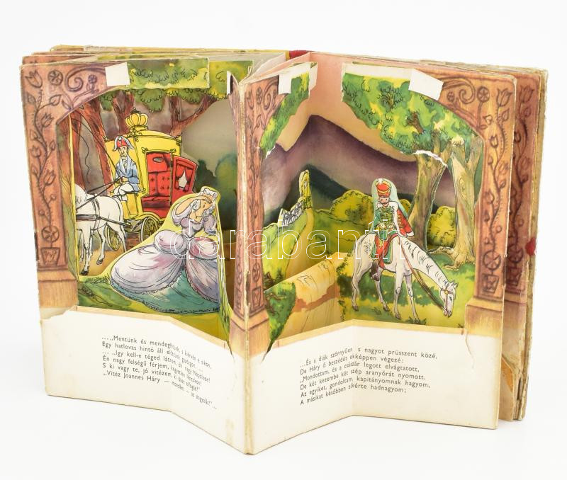 Leírás: Garay János: Háry János. Tankó Béla rajzaival. Panoráma Képeskönyvek 3. Bp.,én.,Offset Nyomda. Térbeli mesekönyv. Kiadói félvászon-kötés, kopott borítóval, sérült, hiányos táblákkal.