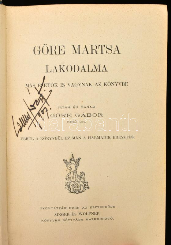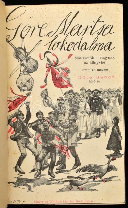 [Gárdonyi Géza] Göre Gábor: Göre Martsa lakodalma. Bp., [1897], Singer és Wolfner (Márkus Samu-ny.), 157+(3) p. Első kiadás. Kiadói egészvászon-kötés, márványozott lapélekkel, helyenként kissé foltos lapokkal.