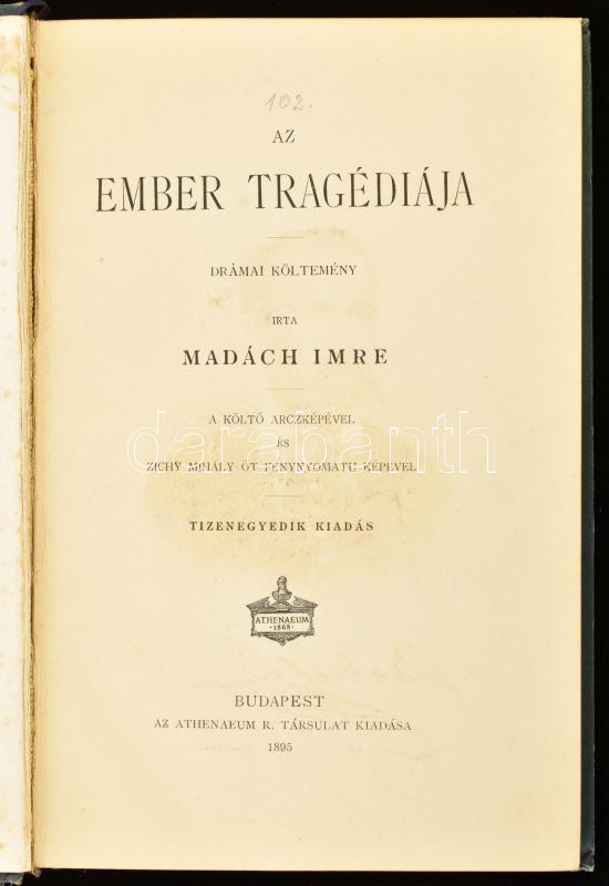Leírás: Madách Imre: Az ember tragédiája. Bp., 1895, Athenaeum. Kiadói aranyozott, festett egészvászon kötés, kopottas állapotban, néhol foltos lapok.