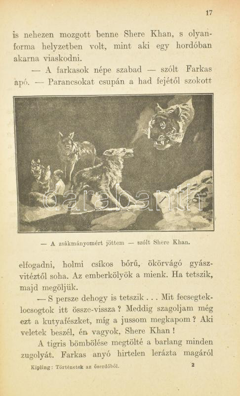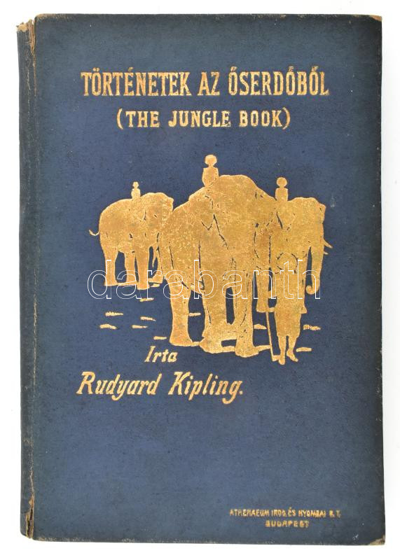 Rudyard Kipling: Történetek az őserdőkből. (Jungle Book.) Ford.: Békési Gyula. Pallagi Gyula bevezetéssel. Bp., én., Athenaeum, 182+1 p. Számos szövegközti és egész oldalas rajzzal illusztrált. Kiadói aranyozott egészvászon-kötés, kopott borítóval, sérült gerinccel, benne foltos lapokkal is.