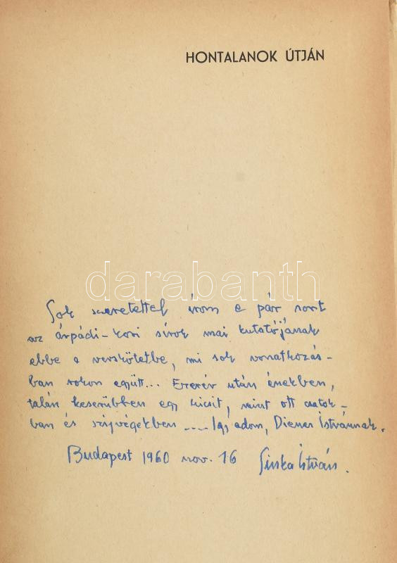Sinka István: Hontalanok útján. A szerző, Sinka István (1897-1969) Kossuth-díjas költő, író által Dienes István (1929-1995) régész, muzeológus részére DEDIKÁLT példány. Bp., 1943, Magyar Élet. Első kiadás. Kiadói félvászon-kötés, kiadói sérült papír védőborítóban, kissé laza fűzéssel, Dr. Dajbukát Gergely ex libris-szével.