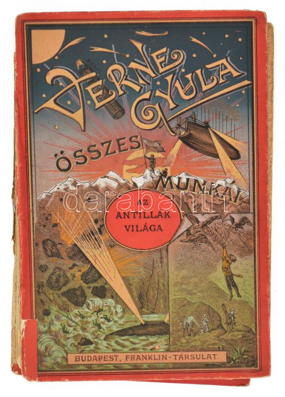 Leírás: Verne Gyula: Az Antillák világa. Ford.: Zigány Árpád. Bp., 1905., Franklin, 231+1 p. Egészoldalas képekkel illusztrált. Kiadói aranyozott, festett illusztrált piros egészvászon-kötés, kopott borítóval, hiányzó gerinccel, névbélyegzőkkel.