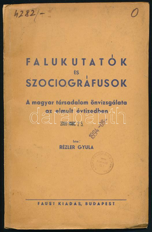 Rézler Gyula: Falukutatók és szociográfusok. A magyar társadalom önvizsgálata az elmúlt évtizedben. Bp., [1943], Faust, 75+(3) p. Kiadói papírkötés, kissé koszos borítóval, intézményi bélyegzőkkel.