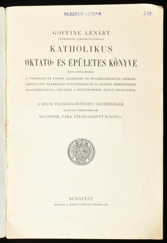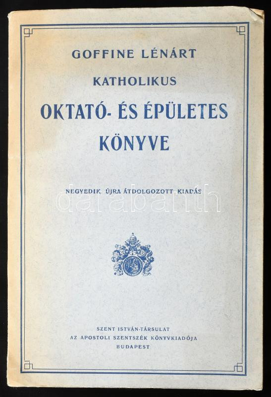 Goffine Lénárt katholikus oktató- és épületes könyve. Bp., 1928, Szent István-Társulat, XXI+(3)+646 p. Negyedik, átdolgozott kiadás. Szövegközi illusztrációkkal. Kiadói papírkötés, a borítón kis sérüléssel.