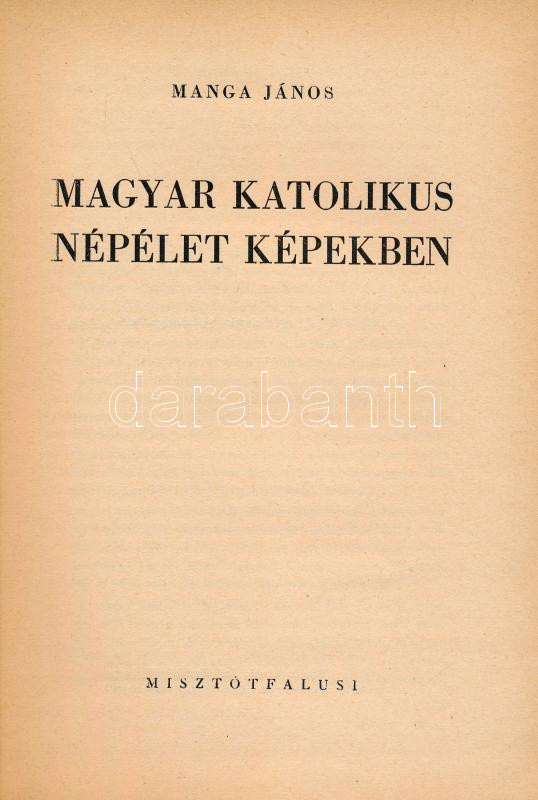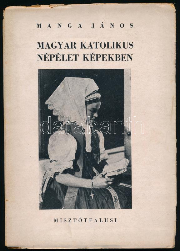 Manga János: Magyar katolikus népélet képekben. [Bp.], 1948., Misztótfalusi, 81 p. A 39. oldaltól egészoldalas fekete-fehér fotókkal. Kiadói papírkötés, kiadói kissé szakadt illusztrált papír védőborítóban.