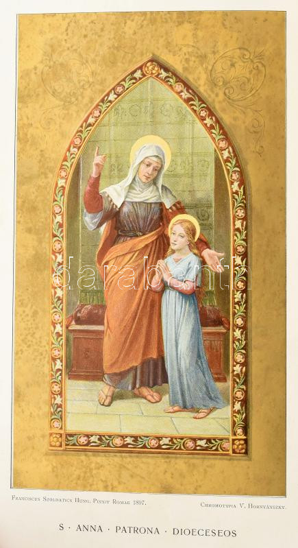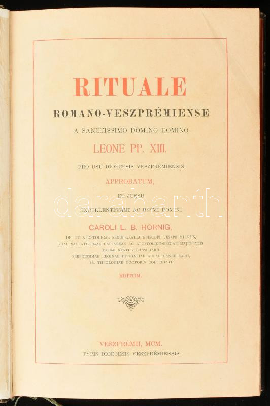 Rituale Romano-Veszprémiense. Szerk.: Caroli L. B. Hornig. [Hornig Károly (1844-1917) báró, veszprémi püspök, bíboros]. Veszprém, 1900, Typis Diocesis Veszprémiensis, 1 (színes) t. + VIII+476 p. Latin nyelven. Kiadói aranyozott egészbőr-kötés, Gottermayer-kötés, festett lapélekkel, kissé sérült, kopottas borítóval, helyenként kissé foltos lapokkal. Ritka!