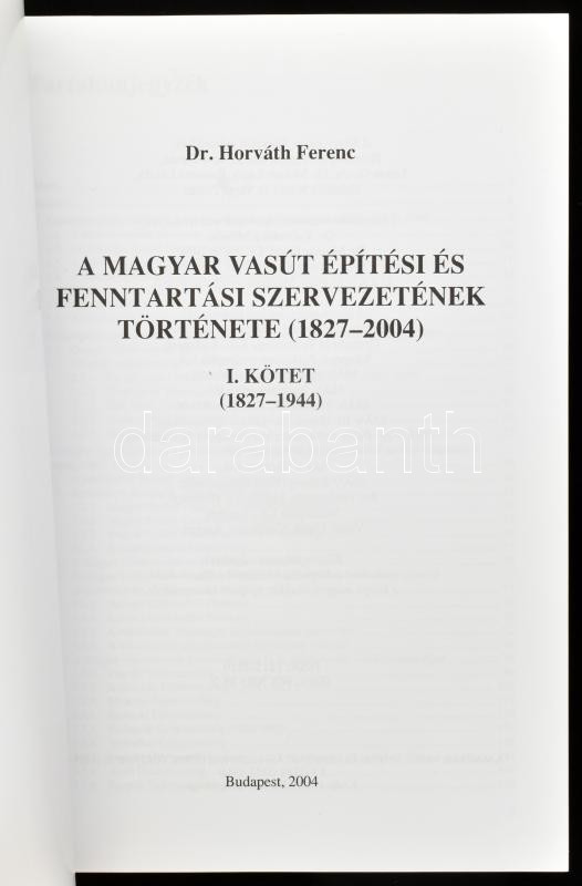 Horváth Ferenc: A magyar vasút építési és fenntartási szervezetének története (1824-2004.) I. köt. (1824-1944.) Vasúthistória Könyvek. Bp., 2004, MÁV. Kiadói papírkötés. Ritka!