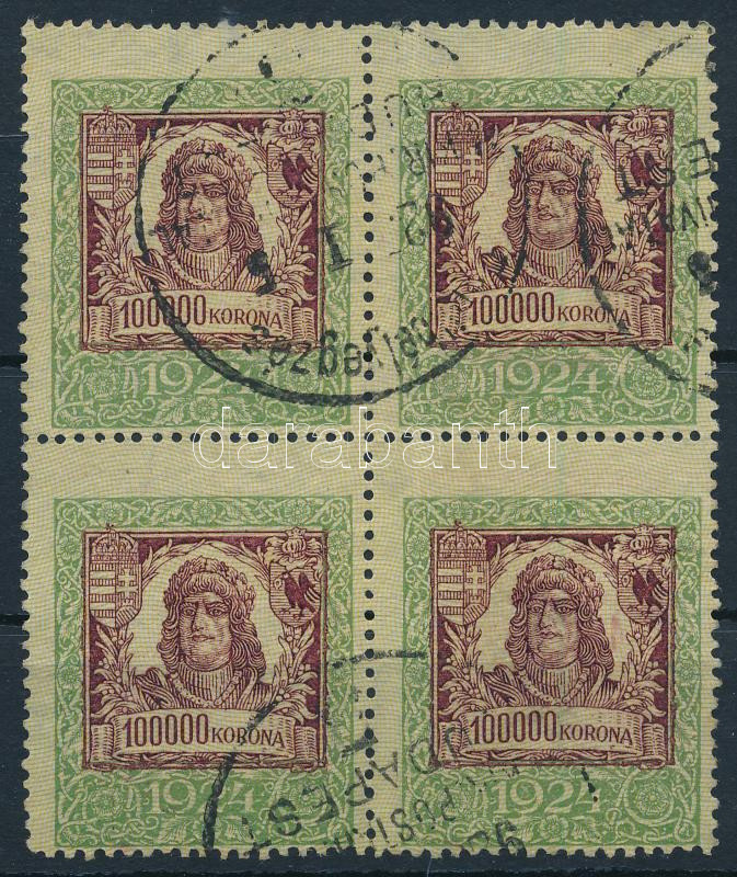 Leírás: 1924 100.000K okmánybélyeg négyestömb elfogazva