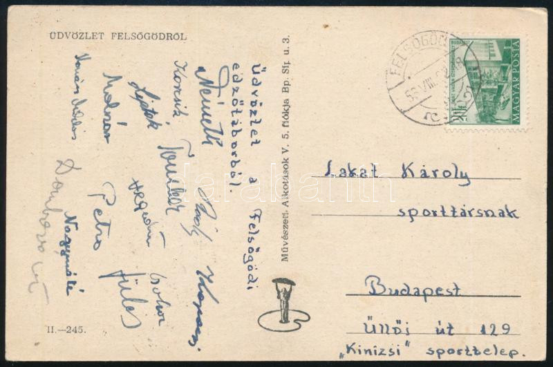 Leírás: 1953 FTC tartalékcsapat tagjainak aláírása Lakat Károlynak címzett képeslapon