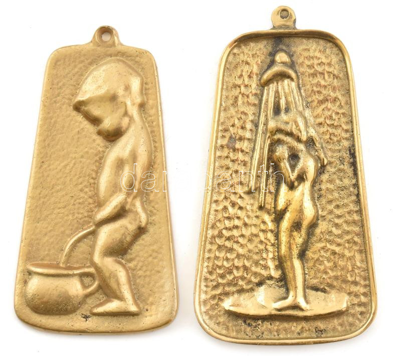 Leírás: 2 db régi réz fürdőszoba jelzés (fiú WC, zuhanyzó), 10x5 cm és 11x6 cm