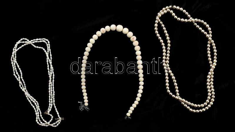 Leírás: 3 db antik nyaklánc: Csont gyöngysor, d: 11 mm-ig, tenyésztett gyöngy dupla gyöngysor, tekla gyöngysor