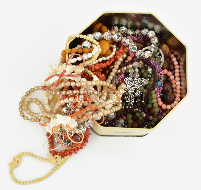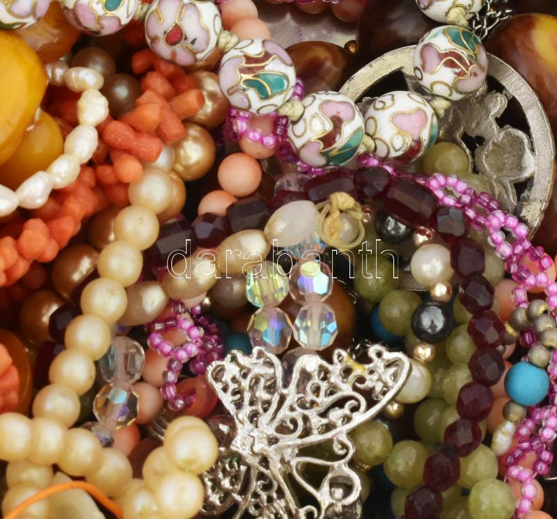 Leírás: Igényes bizsu nyaklánc tétel: gyöngynyakláncok, korall, borostyán, csont, zonácozott fém, egyéb féldrágakő nyakláncok