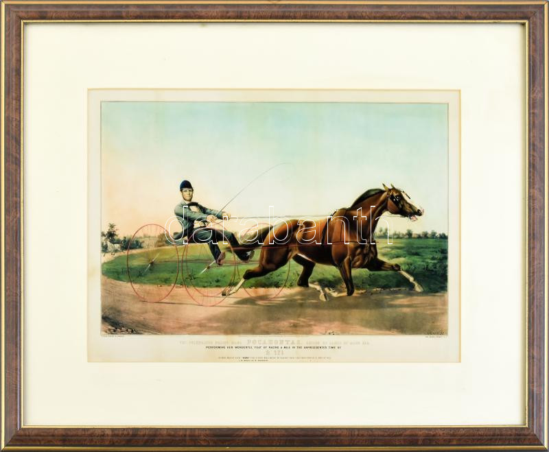 Leírás: Pocahontas versenyló, nyomat, papír, jelzett a nyomaton, üvegezett fakeretben, 17x26 cm