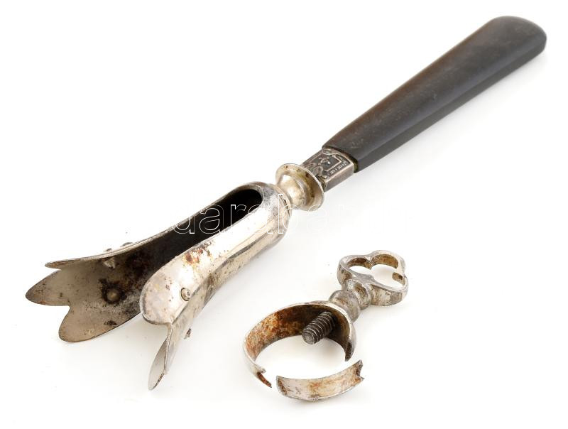 Leírás: Régi pulykacomb fogó, fém-fa, a szorítója törött, h: 21 cm