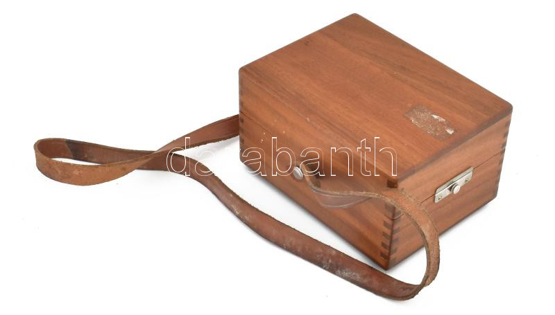 Leírás: Swema-Termometer Stockholm termométer, kissé sérült fa dobozában, bőr szíjjal, 20y15x11 cm