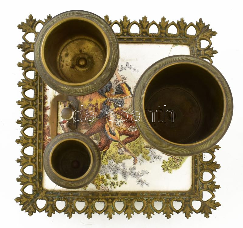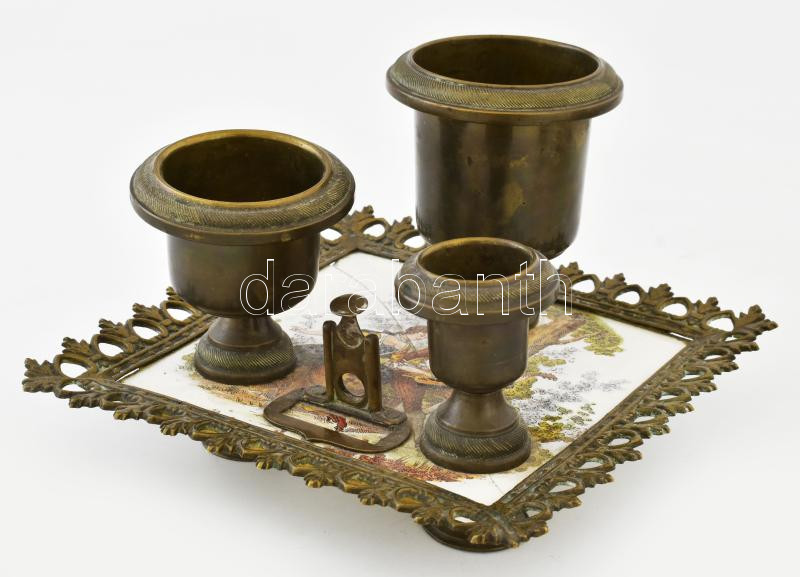 Leírás: Szivar kínáló készlet, szivarvágóval. Réz, fajansz. repedéssel. 19x19 cm, m: 13 cm