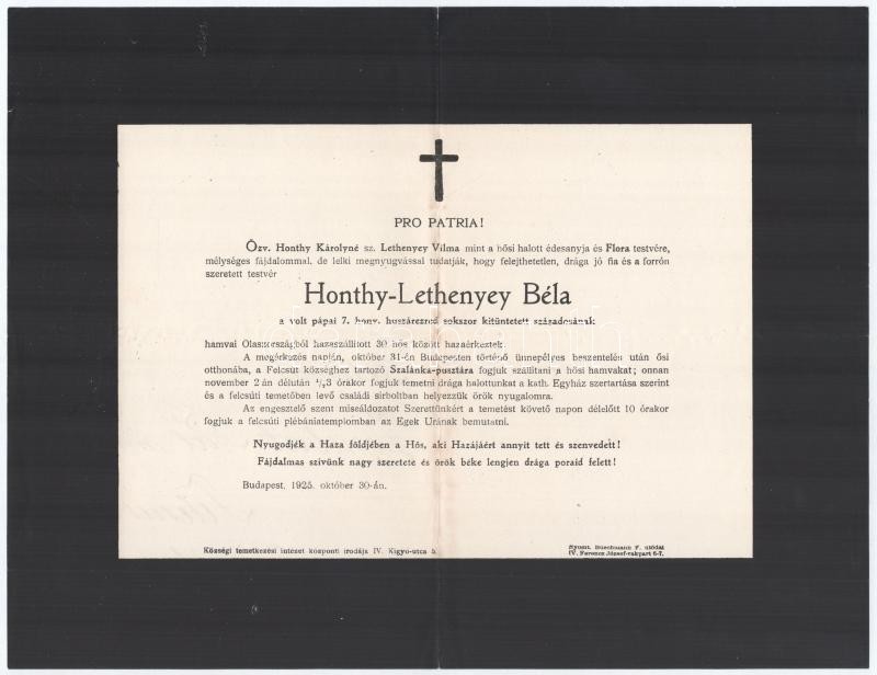 Leírás: 1925 Honthy-Lethenyey Béla pápai 7. honvéd huszárezred századosának hősi hamvainak haza szállításának, és temetésének értesítője.
