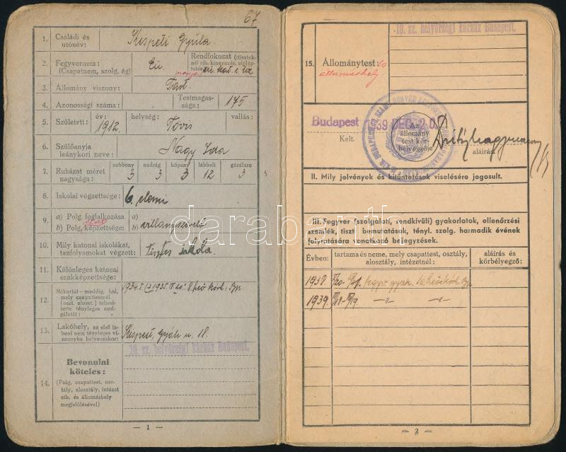 Leírás: 1939 Bp., katonai igazolványi lap, kispesti lakos részére, borítón apró szakadással