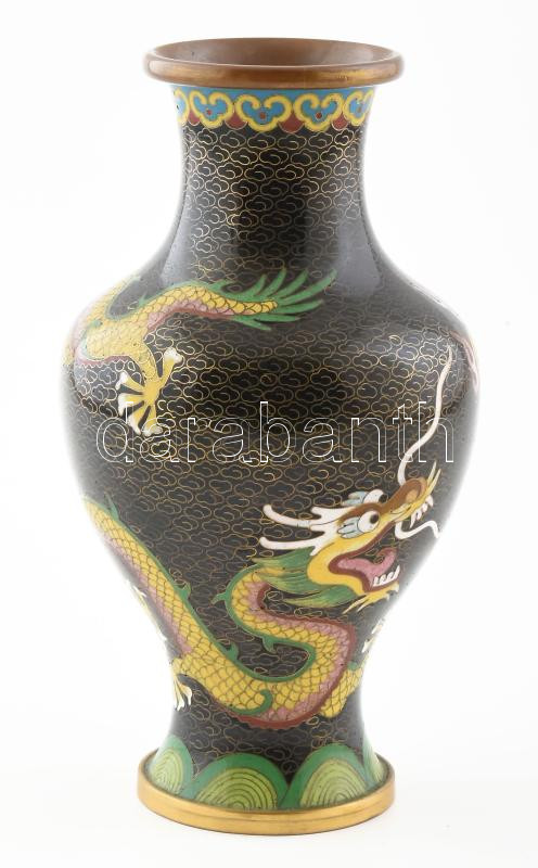 Leírás: Keleti stílusú sárkánymintás tűzzománcos váza, jelzés nélkül, minimális kopással, m: 20 cm
