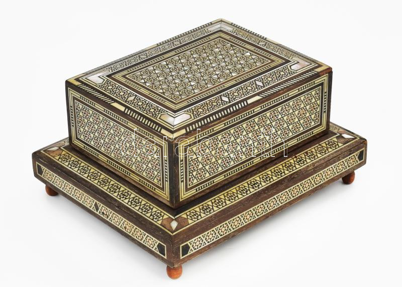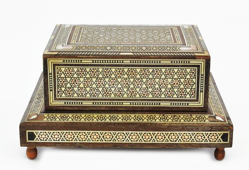 Leírás: Marokkói gyöngyház- és csont berakásos egzotikus fa, zenélő szerkezetes cigarettakínáló, jelzés nélkül, szép állapotban, 22x18x12 cm