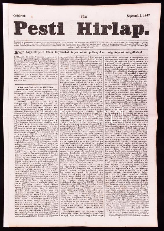 1842 Pesti Hírlap 174. sz. Septemb. 1. 1842. Szerk.: Kossuth Lajos. Pest, Landerer Lajos, javított gerinccel, hajtásnyommal, 621-628 p. Benne korabeli hírekkel, érdekes írásokkal, korabeli reklámokkal, valamint benne az első magyar iparműkiállítás reklámjával és a címlapon arról szóló vezércikkel.