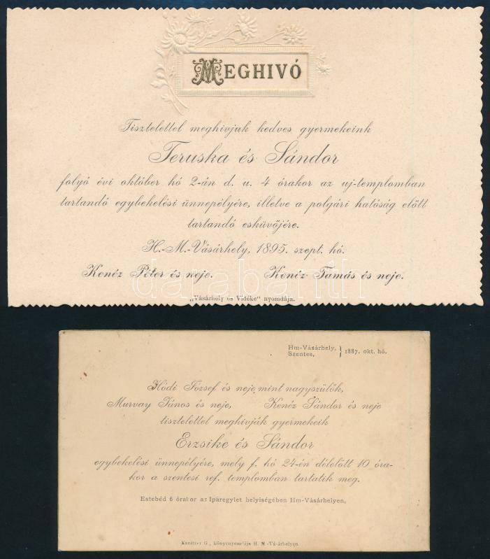 1887-1895 Hódmezővásárhely, Szentes 2 db esküvői meghívó https://www.darabanth.com/hu/445-Gyorsarveres/445.0/Mutargy-papirregiseg-egyeb/Nyomtatvanyok~1500005/1887-1895-Hodmezovasarhely-Szentes-2-db-eskuvoi-meghivo~II2943919