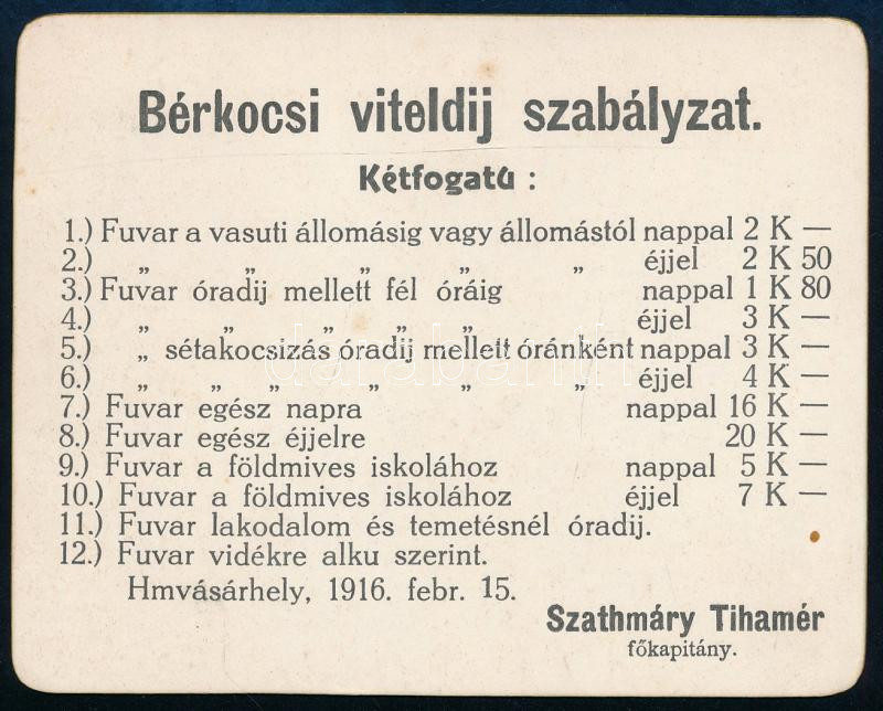 Leírás: 1916 Hódmezővásárhely, Bérkocsi viteldíj szabályzat, 10,5x8,5 cm