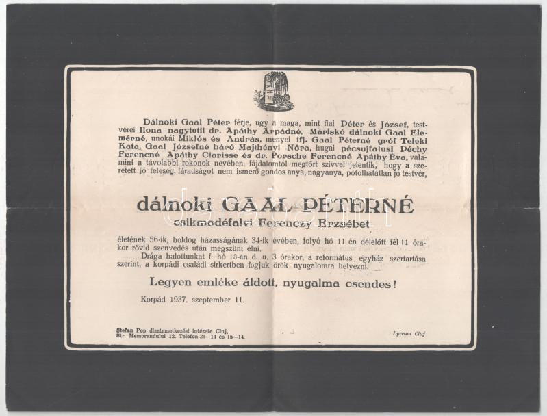 Leírás: 1937 Kolozskorbád, halotti értesítő, hajtott, 29,5×22,5 cm