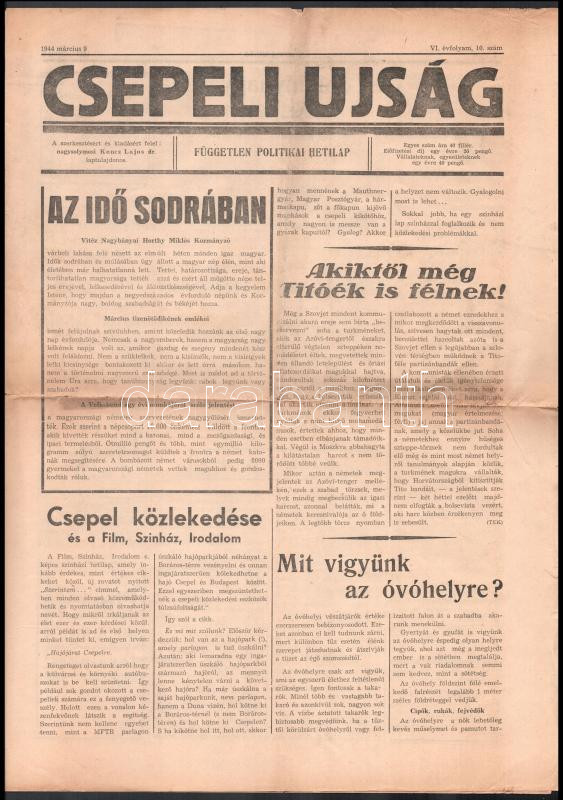 1944 a Csepeli Újság Vi. évf. 10. szám. Horthy Miklósról szóló publici... https://www.darabanth.com/hu/445-Gyorsarveres/445.0/Mutargy-papirregiseg-egyeb/Nyomtatvanyok~1500005/1944-a-Csepeli-Ujsag-Vi-evf-10-szam-Horthy-Miklosrol-szolo-publicisztikaval~II2941795