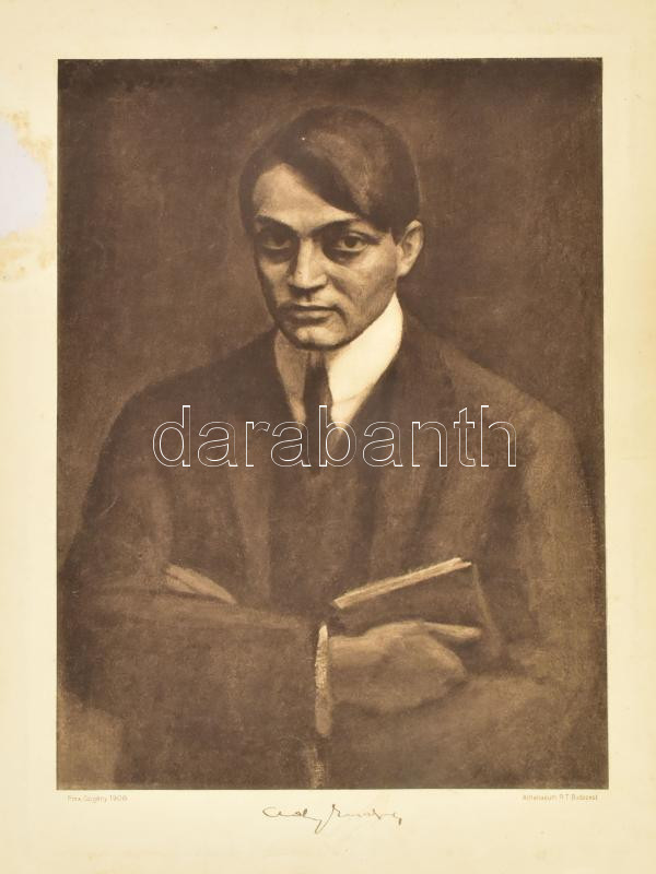 Czigány Dezső (1883-1937) festménye után: Ady Endre portréja. Fénynyomat, papír, jelzett a nyomaton: Pinx. Czigány 1908. Bp., Athenaeum Rt. nyomása. A lap széle sérült, foltos, 31x23,5 cm. (Ritka!)