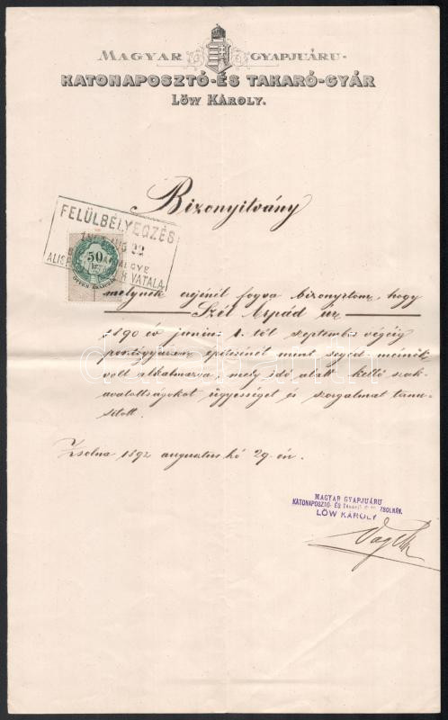 Leírás: 1892 Zsolna, Magyar Gyapjúáru-, Katonaposztó- és Takaró-Gyár Löw Károly által kiállított munkáltatói igazolás, 50 kr okmánybélyeggel