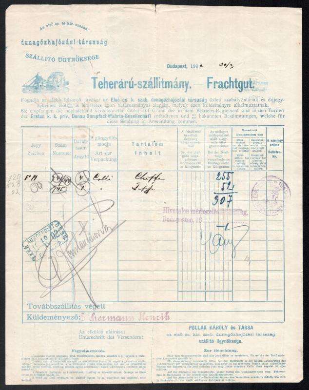 Leírás: 1902 DDSG Dunagőzhajózási társaság teheráru fuvarlevél