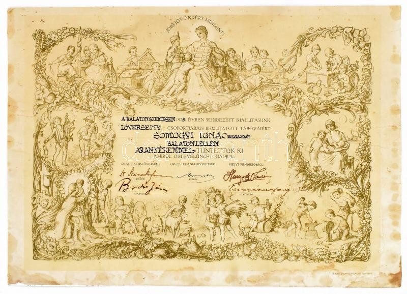 1925 Balatonszemesi kiállÃtás lóverseny csoportjának aranyérmes oklevele, aláÃrásokkal, köztük gróf Apponyi Albert (1846-1933) politikus, miniszter, az Országos Stefánia Szövetség elnökének autográf aláÃrásával. Foltos, viseltes állapotban, kartonra kasÃrozva, 42x30 cm