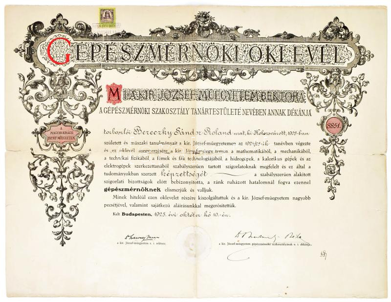 1925 Bp., M. Kir. József Műegyetem által kiállított gépészmérnöki diploma, torboszlói Bereczky Sándor részére, aláírásokkal, felzetes szárazpecséttel, 10000K okmánybélyeggel. Hajtva, szakadásokkal, 60x45 cm