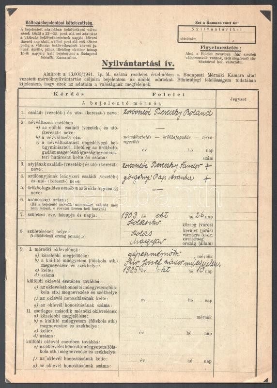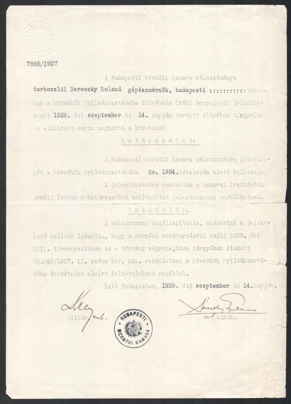 1928 Bp., a Budapesti Mérnöki Kamara határozata torboszlói Bereczky Roland gépészmérnök a Mérnökök Nyilvántartásába való felvételéről + Bereczky Roland kamarai nyilvántartási íve, kisebb szakadással