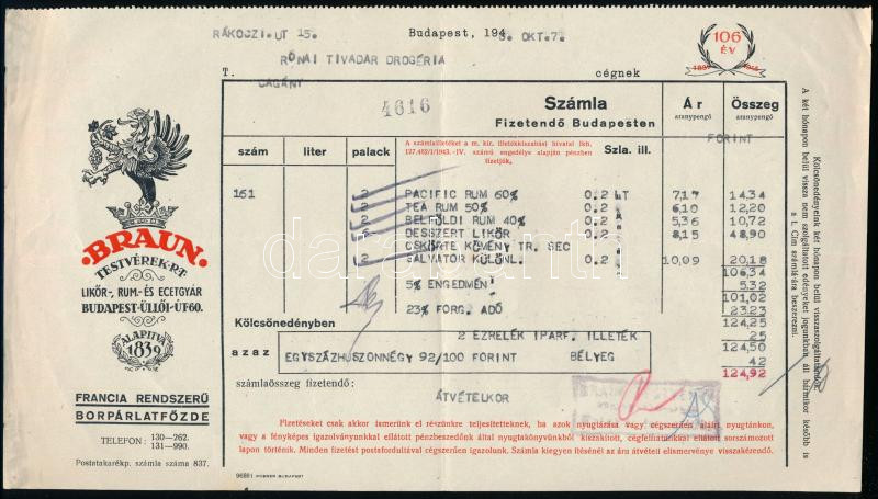 Leírás: 1946 Bp., Braun Testvérek Rt. fejléces számla