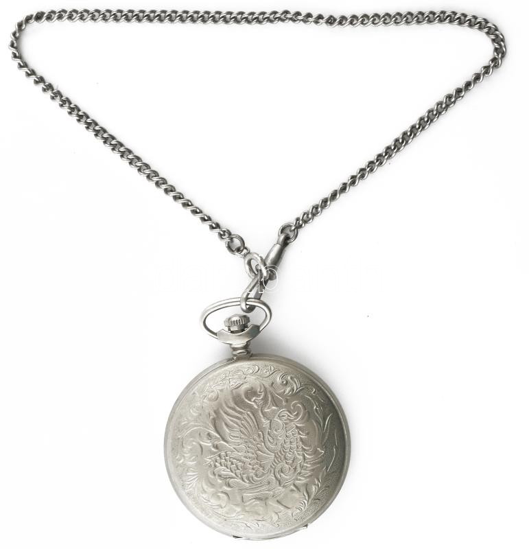 Leírás: Molnija szovjet fémtokos zsebóra, másodpercmutatós, működő, jó állapotban, d: 42 mm Fém lánccal