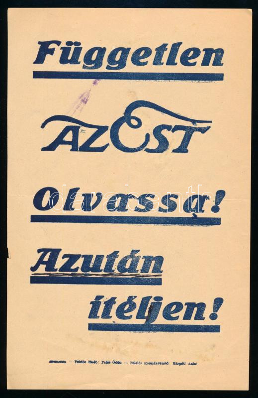 cca 1930 Az Est kisplakát. 14x24 cm https://www.darabanth.com/hu/445-Gyorsarveres/445.0/Mutargy-papirregiseg-egyeb/Plakat~1500006/cca-1930-Az-Est-kisplakat-14x24-cm~II2942579