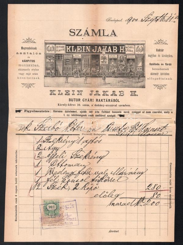 1900 Klein Jakab bútorgyár, Károly krt, fejléces számla. Ragasztva https://www.darabanth.com/hu/445-Gyorsarveres/445.0/Mutargy-papirregiseg-egyeb/Reklam~500024/1900-Klein-Jakab-butorgyar-Karoly-krt-fejleces-szamla-Ragasztva~II2941781