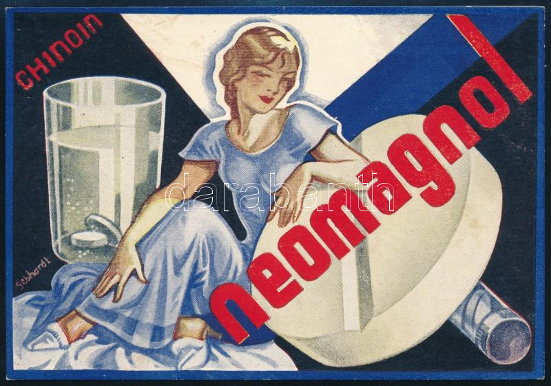 1933 A Chinoin Gyógyszertár Neomagnol fertőtlenítő tabletta art deco reklámlapja postán elküldve, szép állapotban, Gönczi-Gebhardt Tibor (1902-1994) grafikája, 10,5×15 cm