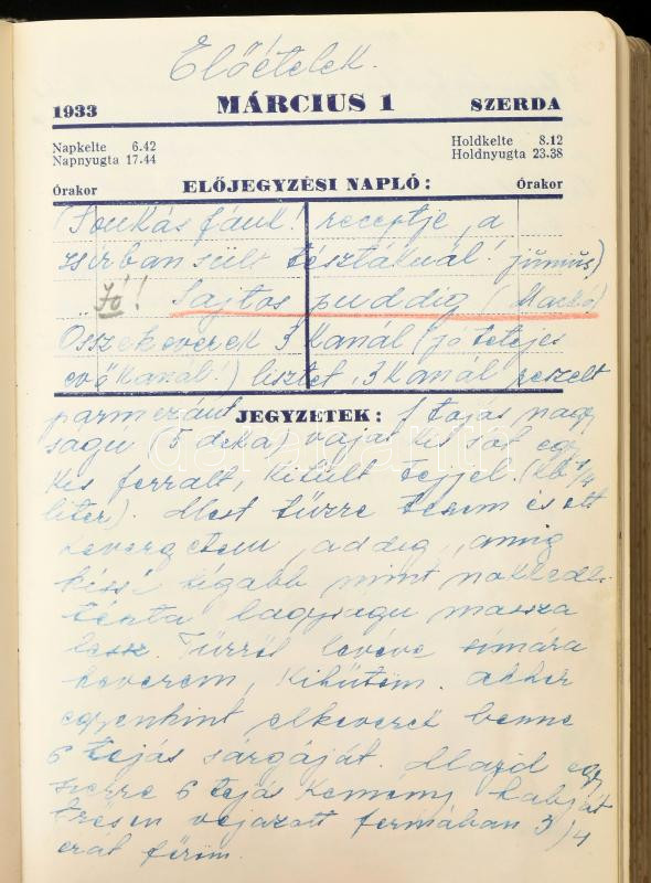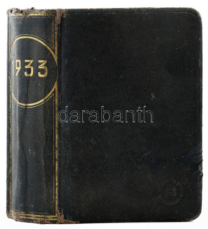 1933 Dr. Rosenberg Sándor gyógyszerészeti laboratórium (Bp. VII., Károly király út 3/a) előjegyzési napló és naptár az 1933. évre. Benne hasznos egészségügyi tudnivalókkal, reklámokkal, bejegyzésekkel (kézzel írt és beragasztott receptek, stb.) Kiadói aranyozott gerincű egészbőr-kötésben, kissé viseltes, kopottas borítóval.