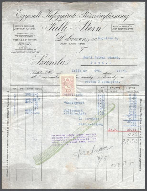 Leírás: 1935 Egyesült kefegyárak R.T., Debrecen fejléces számla