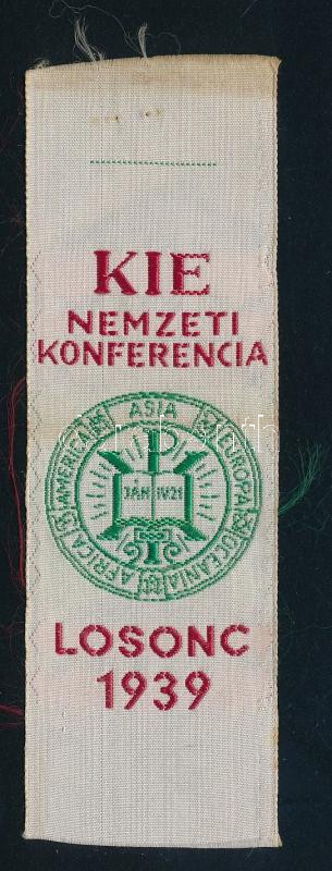 Leírás: 1939 Losonc, KIE konferencia selyem szövet felvarró 3,5x11 cm